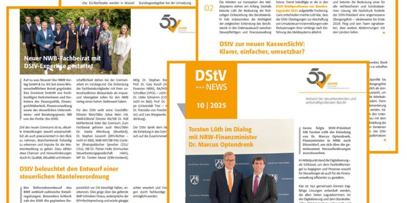 DStV-Präsident im Dialog mit NRW-Finanzminister und neuem BMF-Abteilungsleiter für USt – Steuerfachangestellten-Ausbildung: Spitzenwert im Branchenvergleich – DStV-Positionen zu Entwürfen einer neuen KassenSichV und einer steuerlichen Mantelverordnung – …